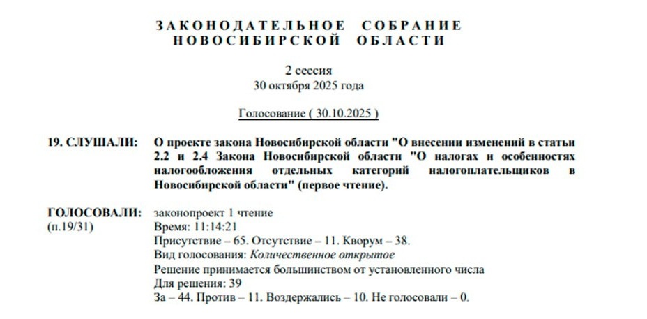 Речь идёт о тех самых пунктах, которые губернатор Андрей Травников продавил через Заксобрание 30 октября 2025 года. В первом чтении депутаты одобрили рост налога для машин до 100 лошадиных сил с 11 до 12 рублей за каждую «лошадь». Для самой массовой категории от 100 до 150 лошадиных сил ставка должна была вырасти с 16,5 до 18 рублей. Рост по обеим категориям — более 9 %.