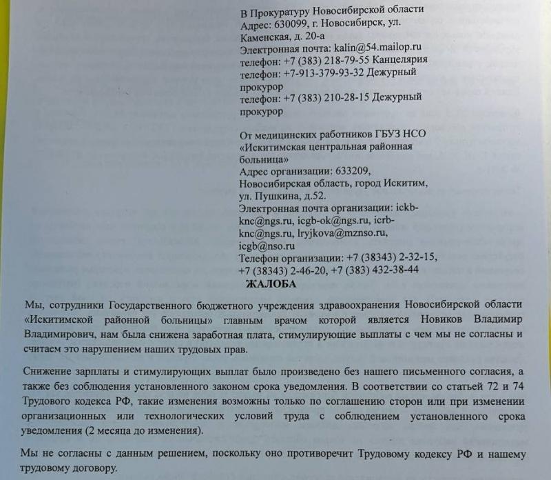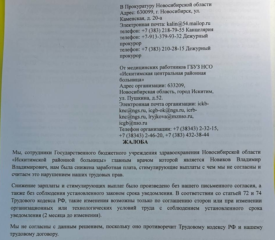 Медики Искитимской ЦРБ дошли до точки кипения и написали открытое письмо губернатору Андрею Травникову. Под обращением подписались более 100 человек, а петицию поддержали более полутора тысяч граждан. Люди прямо говорят: больница разваливается. С января 2025 года в учреждении забыли про индексацию зарплат, а вместо повышения доходов медики получили урезание стимулирующих выплат. Ситуация абсурдная: фельдшер скорой помощи в сентябре этого года получил на руки 32 тысячи рублей. Медсестра в октябре — всего 20,7 тысячи. На такие деньги сегодня сложно просто выжить, не то что спасать жизни.