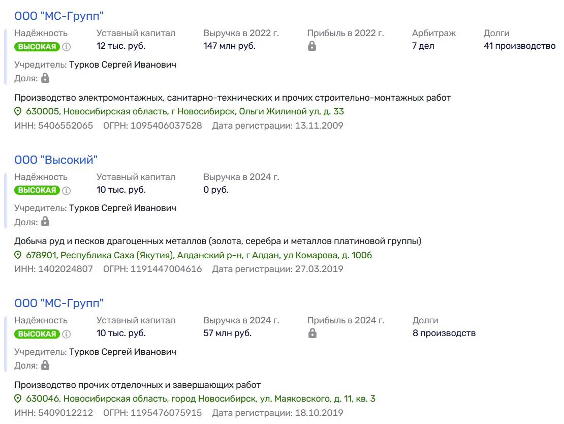 Финансовые показатели Сергея Туркова также заслуживают внимания. При общем обороте трёх компаний в 57 миллионов рублей их выручка на конец 2024 года составила примерно 1,4 миллиона. Параллельно Турков владеет 50% доли в ООО «Высокий», которое занимается добычей руд и драгоценных металлов. Золотодобытчик и «специалист по безопасности» в одном лице не обеспечил элементарную безопасность своего самого проблемного актива.