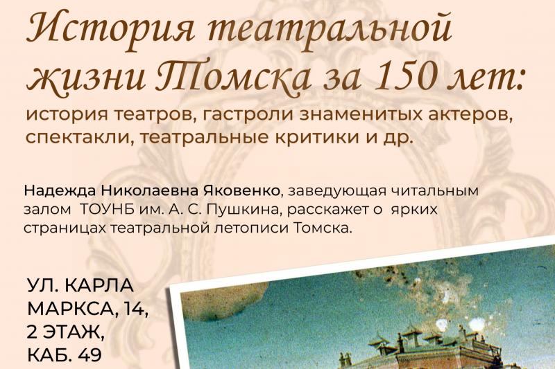 10 октября в Томской областной универсальной научной библиотеке имени Пушкина пройдёт лекция «История театральной жизни Томска за 150 лет».