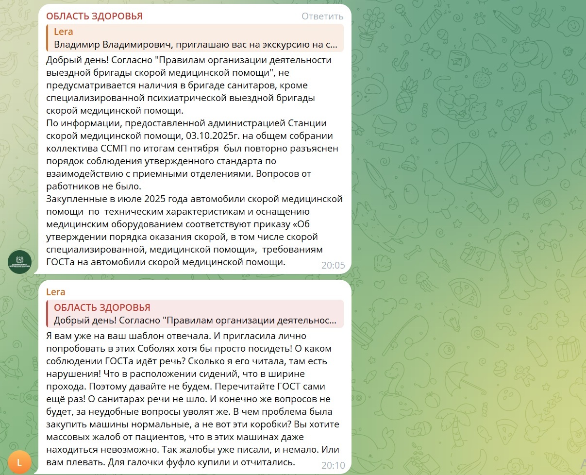 На все эти аргументированные претензии Департамент здравоохранения Томской области отвечает как под копирку: «Закупленные машины соответствуют требованиям регламентирующих документов и стандартам оснащения автомобилей скорой медицинской помощи». Чиновники также сообщили, что на недавнем собрании коллектива «вопросов от работников не было». Такой ответ вызвал лишь новую волну возмущения. «Конечно же вопросов не будет, за неудобные вопросы уволят», — ответила Лера, предложив сотрудникам депздрава лично посидеть в этих «Соболях».