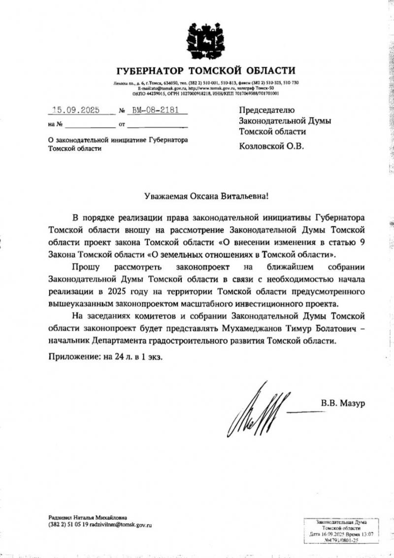 Губернатор Владимир Мазур внес на рассмотрение Законодательной думы Томской области законопроект, по которому застройщики смогут без торгов получать земельные участки для реализации «масштабных инвестиционных проектов».