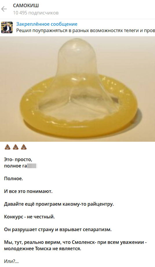 Экспрессивное высказывание Самокиша вызывает недоумение. Что или кого символизирует презерватив? Что или кого подразумевает депутат под «полным г…» – Смоленск, конкурс или томичей, недожавших в голосовании? «Давайте ещё проиграем какому-то райцентру», – здесь единоросс явно корит своих земляков и пренебрежительно отзывается о городе с более чем 300-тысячным населением.