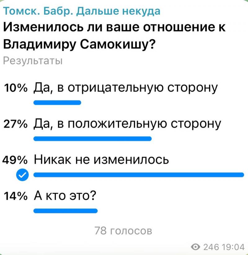 Очень жаль, что весьма продуктивный депутат своим поведением перечеркнул всё то хорошее, что сделал. В 2026 году ему вряд ли удастся переизбраться в Госдуму. Хотя кто знает… В тг-канале «Томск. Бабр. Дальше некуда» (@vtomsk24) мы провели опрос «Изменилось ли ваше отношение к Владимиру Самокишу?». В нём приняли участие 78 человек. 49% реципиентов выбрали ответ «Никак не изменилось», а 27% – «Да, в положительную сторону».