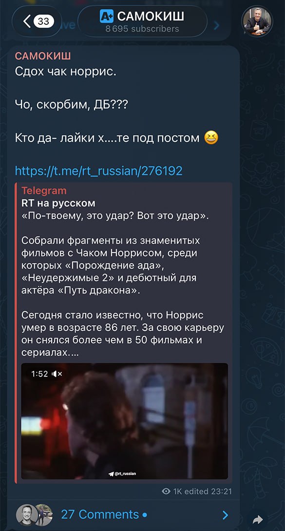 Через некоторое время в телеграм-канале Владимира Самокиша появился пост с сообщением «Сдох чак норрис» (орфография автора сохранена). В комментариях депутат назвал актера «потным г*******, прославляющим антисоветскую повестку».