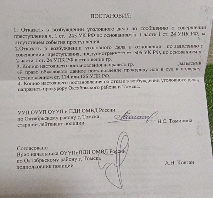 Томский активист Антон Исаков в своём тг-канале опубликовал пост о том, что два случая отравления бездомных собак оказались без признаков преступления. К посту он прикрепил документы, подтверждающие его слова. УМВД России по ЗАТО Северск отказало в возбуждении уголовного дела после проведения проверок по заявлению, поступившему в январе 2026 года. По словам следователей, отсутствует событие преступления. Отдел полиции по Октябрьскому району Томска вынес точно такое же решение.